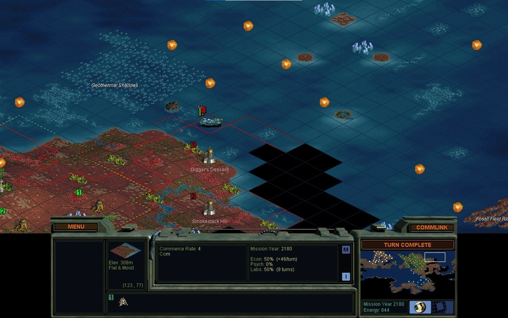 MY 2180.  "Broken back" Domai popped my foil probe team with a laser foil.  And Aki-Zeta5 seemed to sink another one with an artillery barrage near one of her cities.  Hadn't even seen the city yet.  Well, still got some teams to go.  And plenty of exposed University cities.  I won't bother with that very long distance ocean hiking again.  Way too tedious.