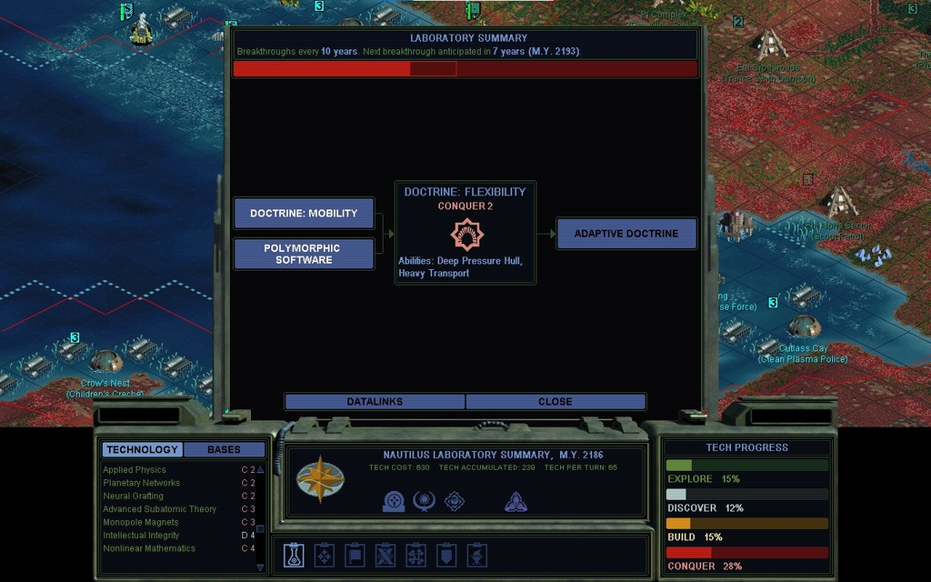 MY 2186.  Tech-wise, this is a weird game.  I still don't have E1 Social Psych.  I can't get the C3 Adaptive Doctrine I want.  There isn't going to be any Command Nexus any time soon, and I've got cash I'd better spend.  I don't even need Artifacts.  I can buy something outright with cash.
