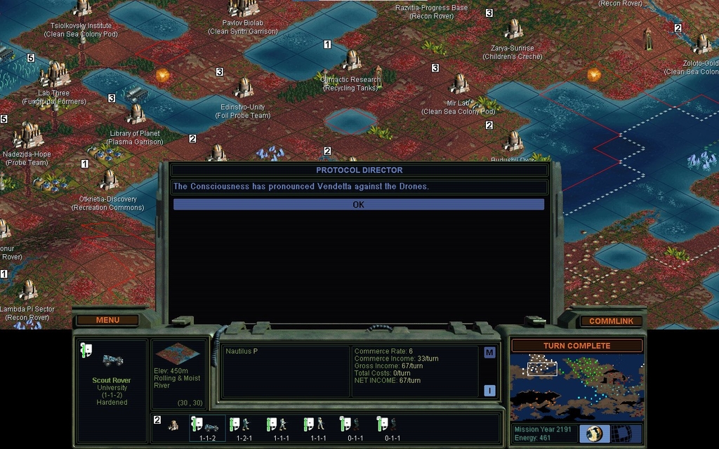 Once again no Aliens to bother us.  Cult of Planet makes its debut.  To be irritated further by Spartans, Cyborgs, Free Drones, Believers, and the University.  Rather similar to last game.  Cult instead of Gaians, that's the only change.