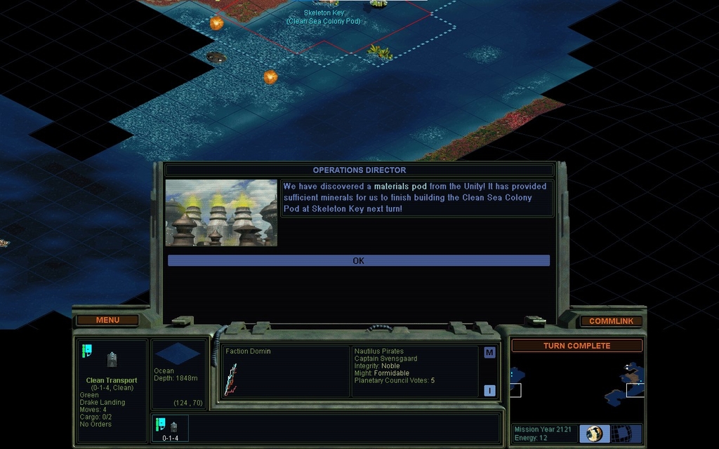 Over the last 2 turns, the supply pods in the Sargasso Sea have been disappearing.  Maybe that Free Drone ship is still in there and somehow survived.  I'm going in after it.  Whoever popped all of this, managed to do it without triggering a kelp explosion.  I'd like to believe that meant they set off some Isles instead, so it's hard to believe a ship could survive in there unwounded.  Maybe the last pop will have finally killed it, and I may find nothing.
