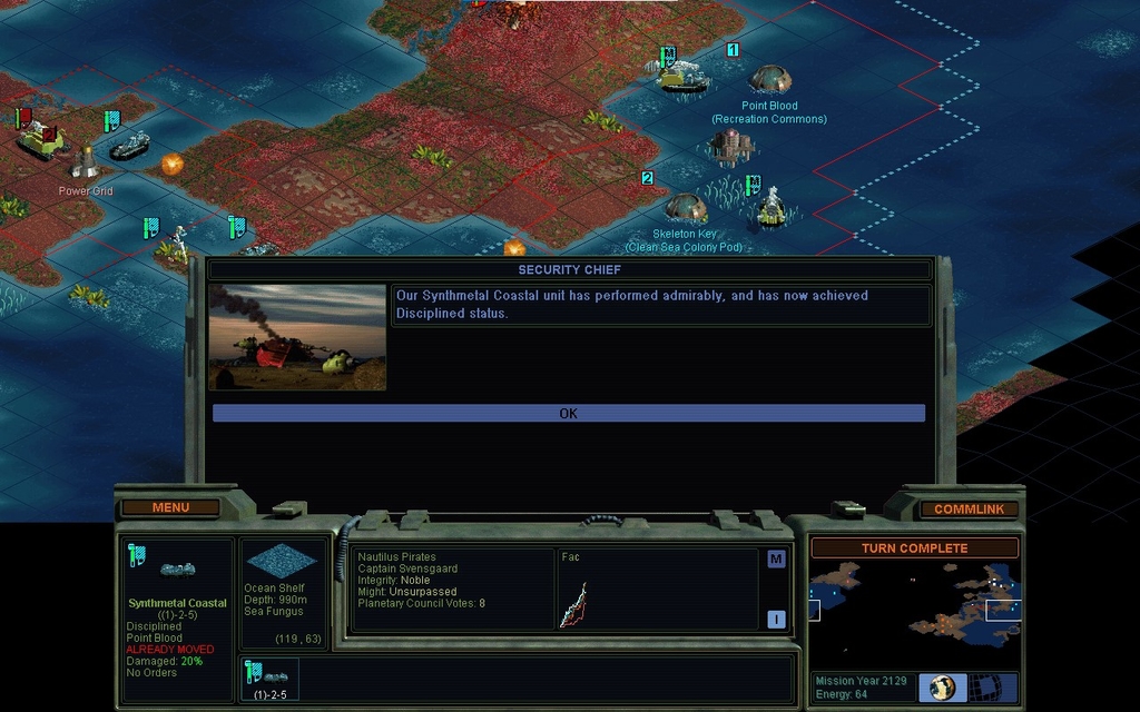 MY 2130.  Seems the Thinker AI knows how to perform artillery duels.  In this case that was clearly suicide, so it doesn't know how to perform them well.  But I'll take it.  Saves me the PITA of going over all these fungal squares.  Only question remaining is whether there's more than 1 ship.  I doubt it though.  I only ever saw the 1 ship, and I've been up and down their channel bringing an Artifact home.  That was pretty risky behavior at the time, but I just had an instinct that they really didn't have that much to throw into the ocean.